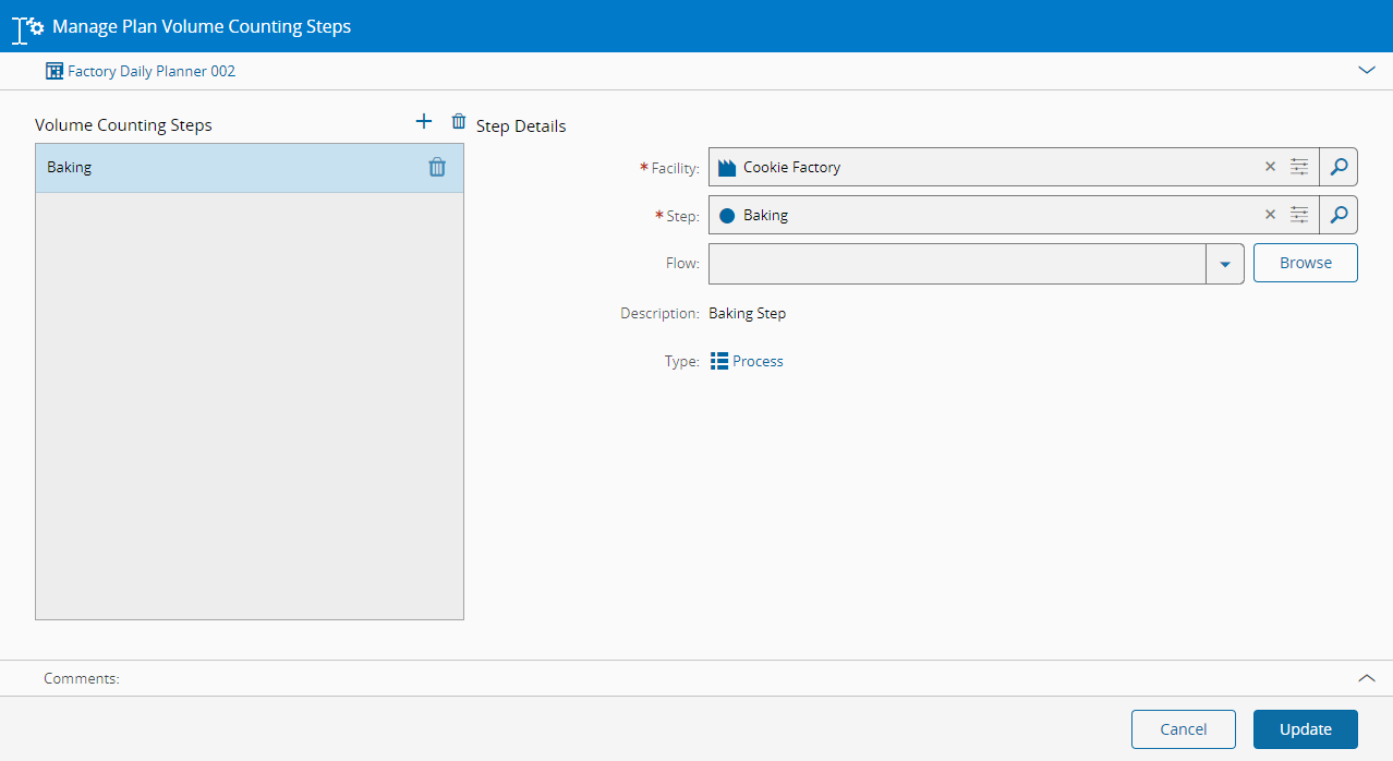 - The Step, selected from the list of Steps available in the manufacturing level selected for the Plan.