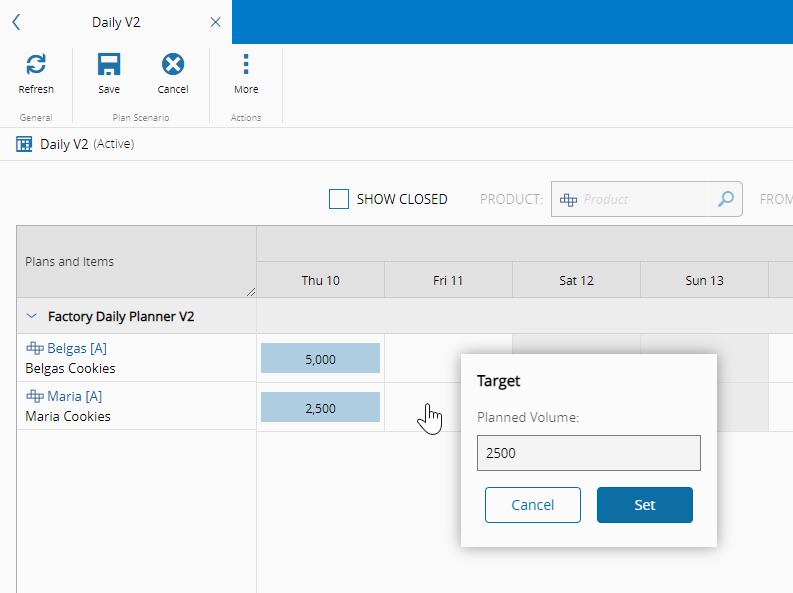 Unlike the Edit Plan operation that allows editing the actual Plan, editing a Plan Scenario places the current Plan Scenario in an editing mode, allowing you to perform changes to the planned values defined for each of the time frames available. Selecting any of the grid cells will show a small popup dialog where you can enter the new target value for that time frame.