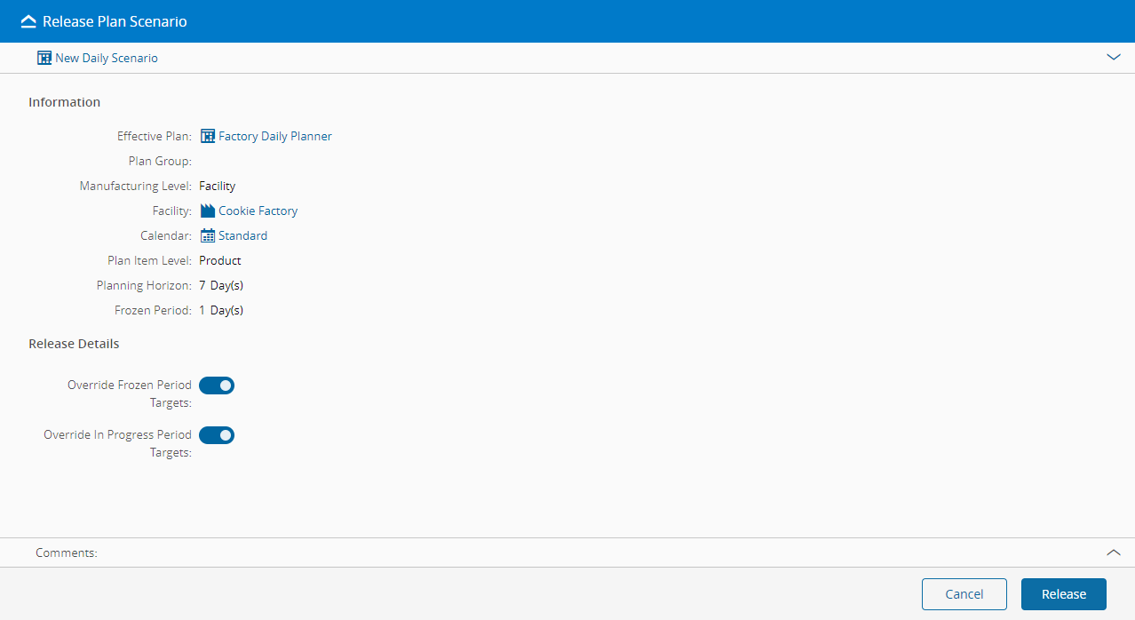 You can release a Plan Scenario from the Release button located on the top ribbon of the Plan Scenario page.