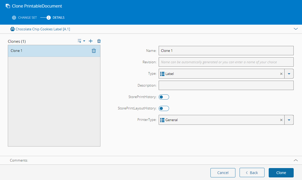 The Clone Printable Document wizard can be called from the Printable Document page within the Business Data Group. The default values will be taken from the current Printable Document to be used as a base for the new object. Since this is a versioned entity, there are two possible procedures: entity and revision cloning, both of which are available from the main details page. Select Clone on the top ribbon, followed by Entity if you want to clone the complete entity along with the first revision and version of the new entity, or Revision if you want to clone only a single revision. In either case, a Change Set must be supplied for a version of the revision to be made effective in the future.