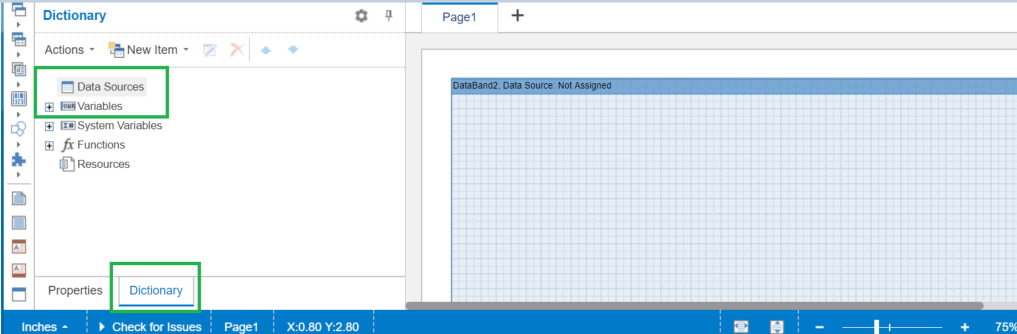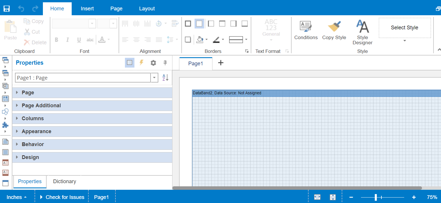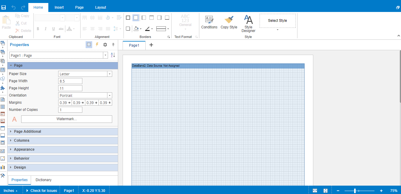 The default layout (used when a new Printable Document is created), is composed of a single page containing a single Data Band with a few properties set, such as: