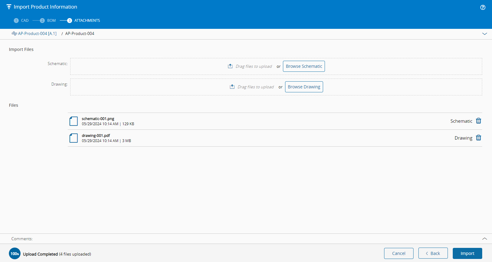- Select the Schematic (a representation of the elements of a system using abstract graphic symbols) files to import by dragging one or more files from the file explorer or by selecting Browse Files and selecting a file manually. File information will be displayed on screen after the file is loaded and analyzed by the system. Selecting the button on the right of the entry will remove the file from the import queue.