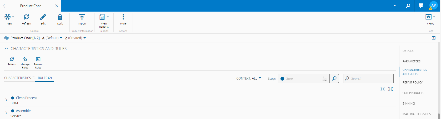 The Preview Rules wizard can be called from the Product page by selecting Characteristics and Rules from the section menus on the right, and then selecting the Rules tab.
