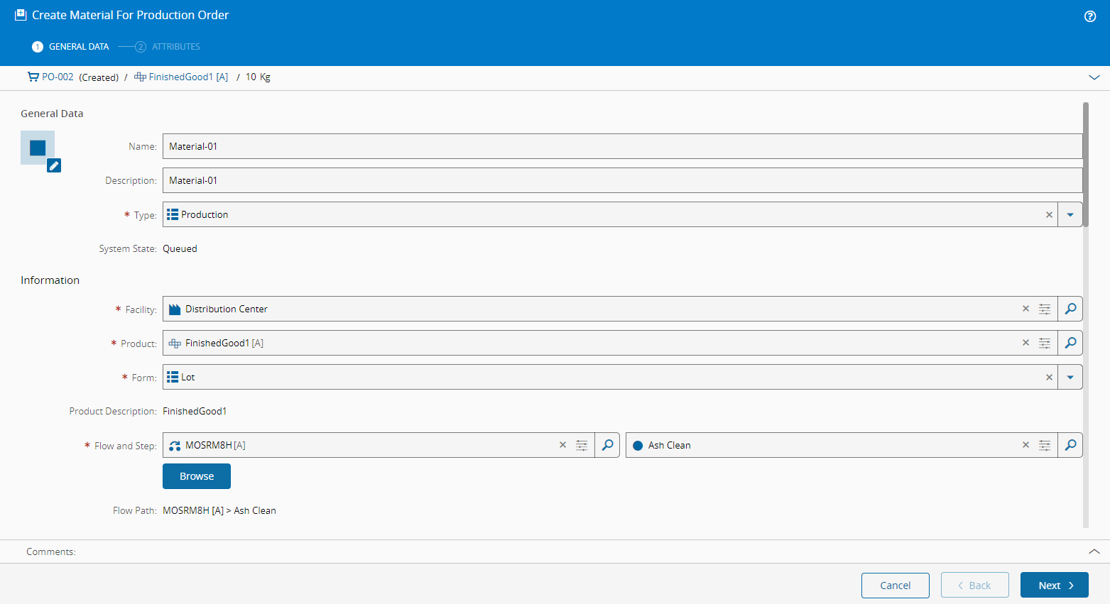 (Production Order Quantity - Production Order In Progress Quantity - Production Order Completed Quantity) / (Product Standard Yield)adjusted to the Material Step units, but it can be changed. - The Flow is set with the Production Order Flow and Production Order Flow Path (if defined) - but it can be changed.