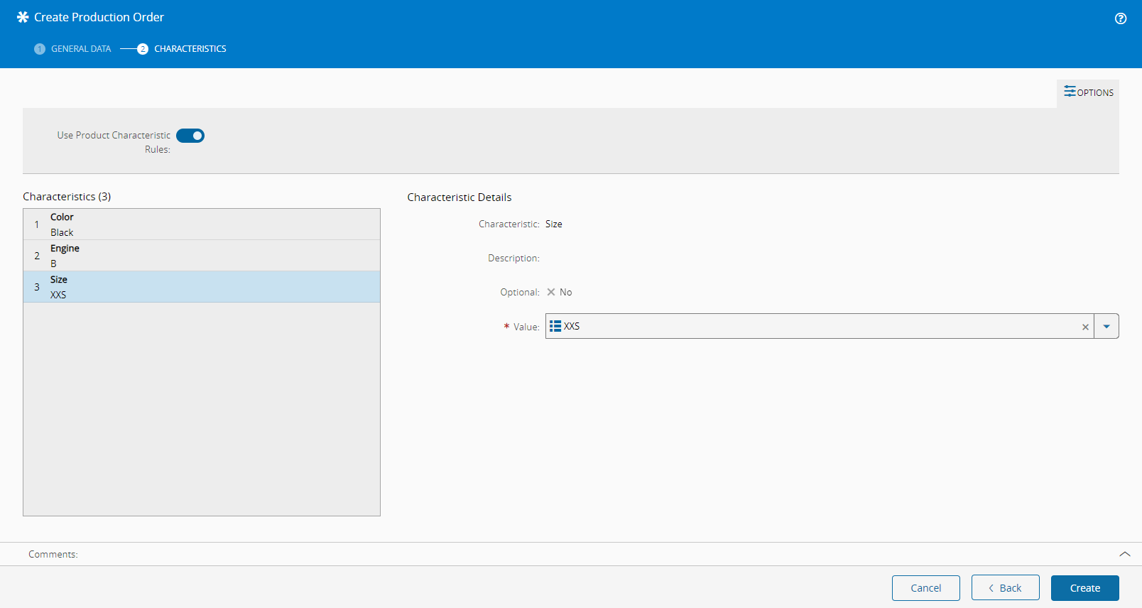 - Specifies whether the Product Characteristic Rules are to be applied for this Production Order by checking or unchecking the respective option.