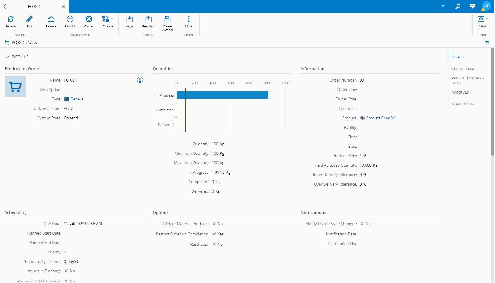 - Details - displays general information on the Production Order.