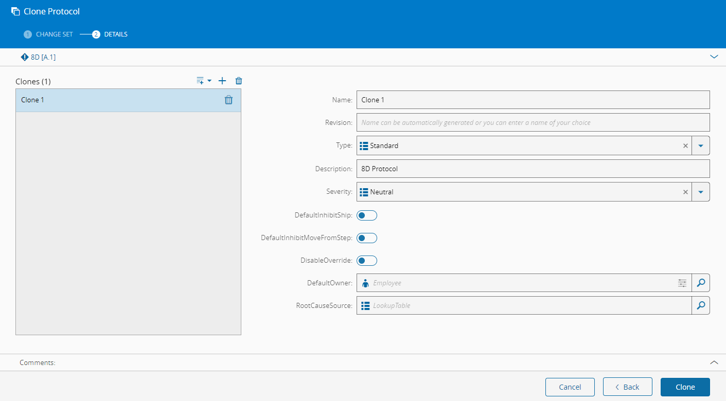 The Clone Protocol wizard can be called from the Protocol page within the Business Data Group. The default values will be taken from the current Protocol to be used as a base for the new object. Since this is a versioned entity, there are two possible procedures: entity and revision cloning, both of which are available from the main details page. Select Clone on the top ribbon, followed by Entity if you want to clone the complete entity along with the first revision and version of the new entity, or Revision if you want to clone only a single revision. In either case, a Change Set must be supplied for a version of the revision to be made effective in the future.