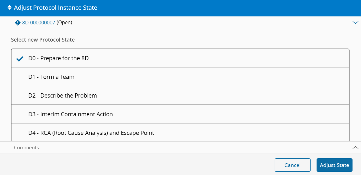 This operation is used to change the state of the Protocol Instance without skipping the restrictions. The Protocol Instance can be changed to any state, even if not following the defined state flow.