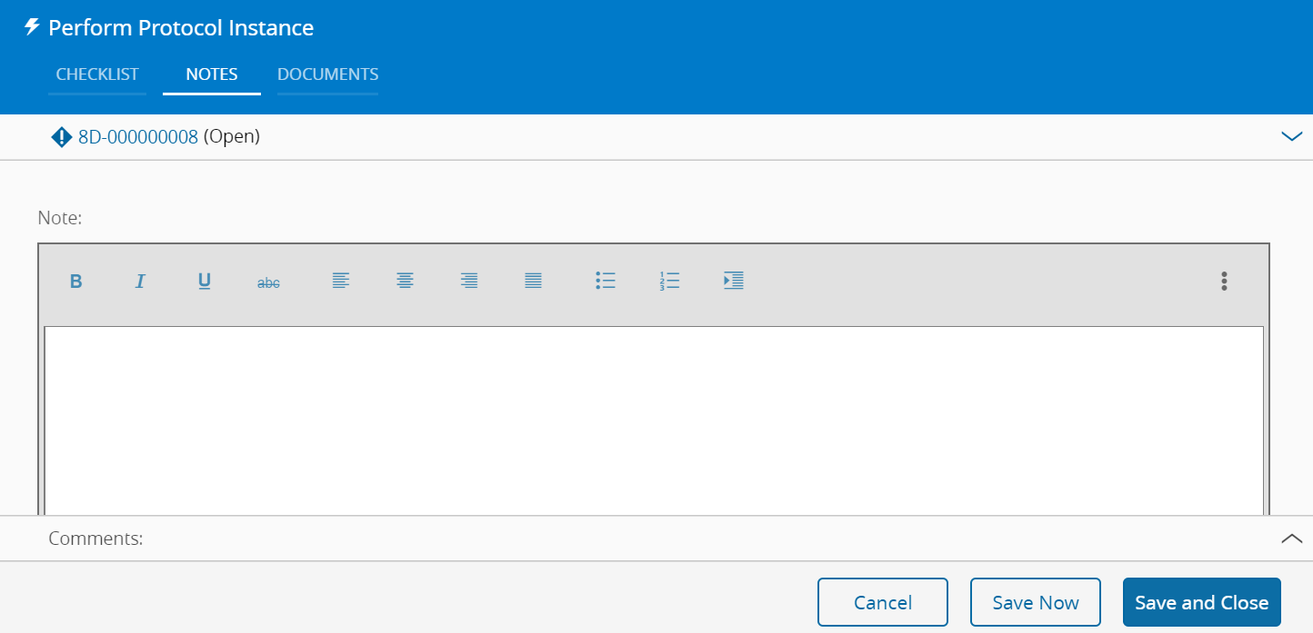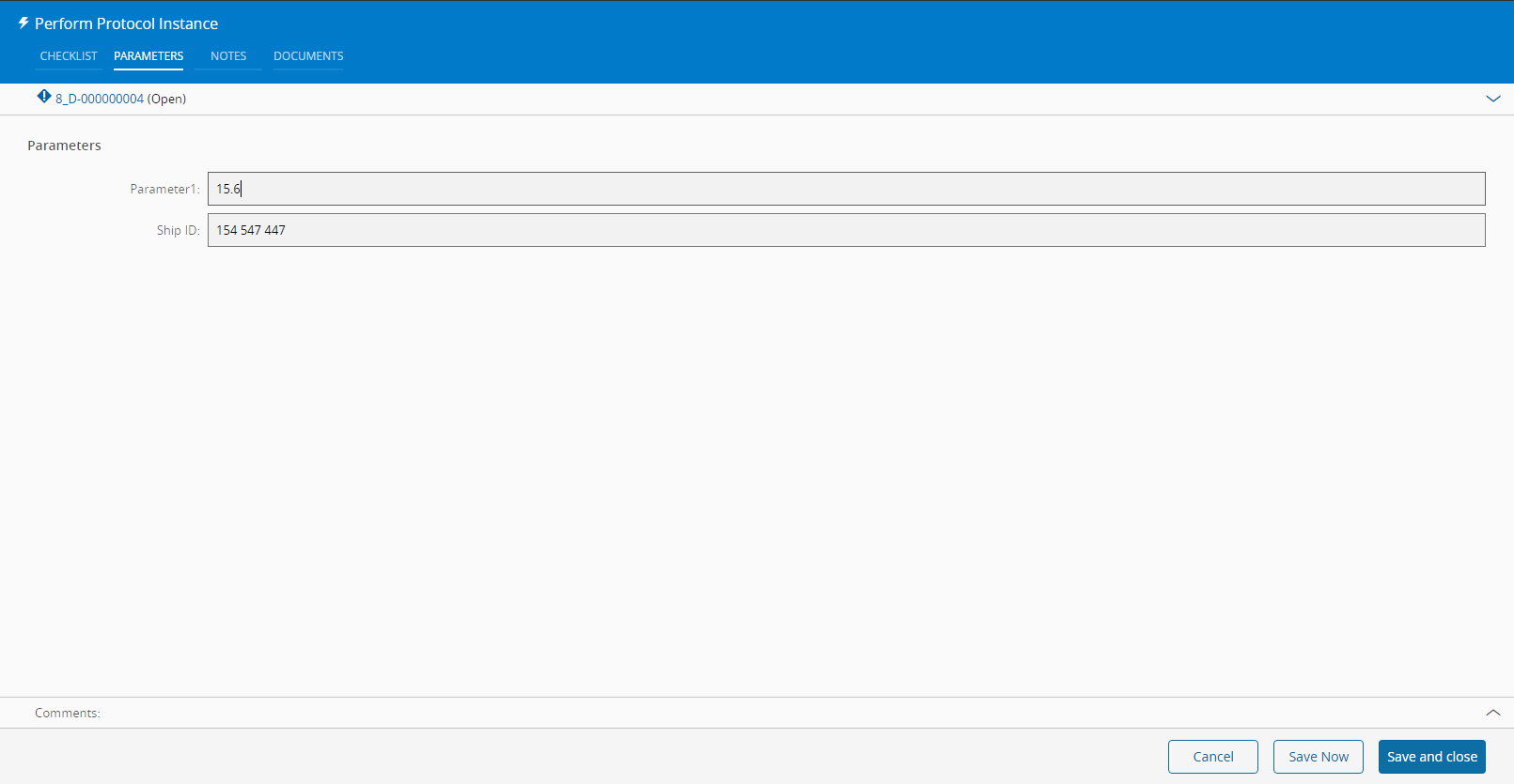 This operation is used to execute, partially or completely, a Protocol Instance. The Details to be performed need to be inputted beforehand and it is possible to perform them intermittently by clicking on Save and Close and performing the remaining Details at a later stage.