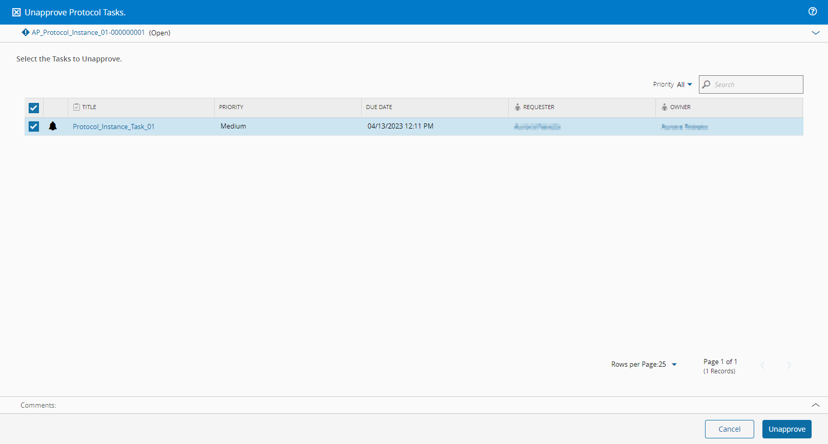 1. In the Details view, Open the Protocol Instance and select the button Unapprove.