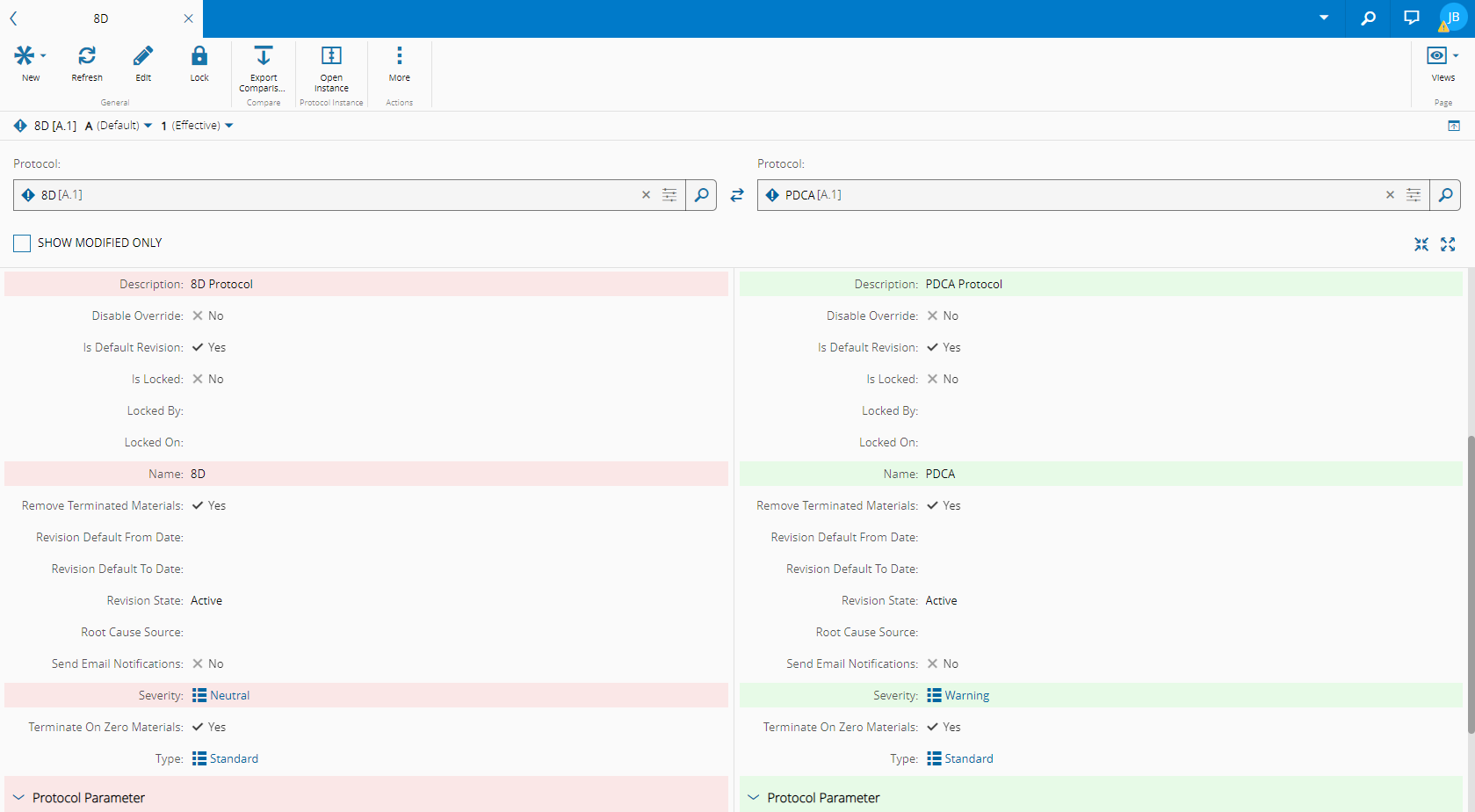 This view provides a quick visual comparison between the selected entity version and any other version that can be selected through it. You can also export the comparison results to a PDF file through the Export Comparison button on the top ribbon. For more information, see Compare Entity Versions.