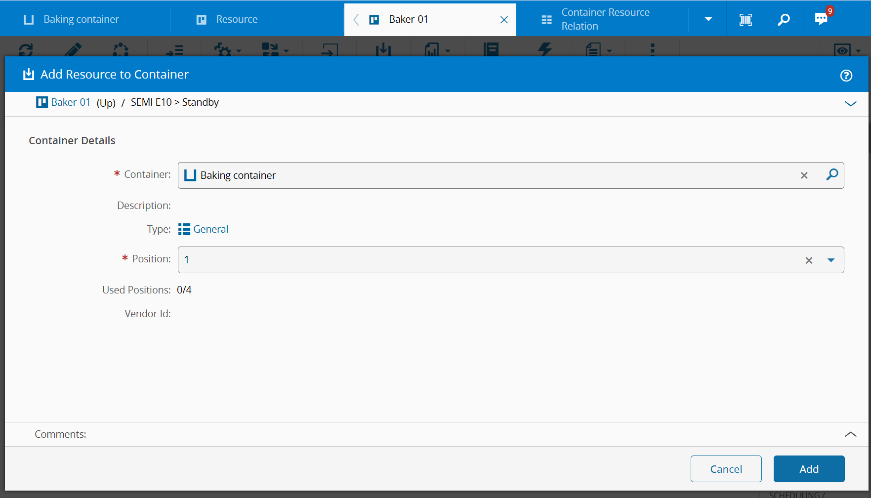 True, you must supply an unused Container position for the Resource. - Optionally, enter a Comment.