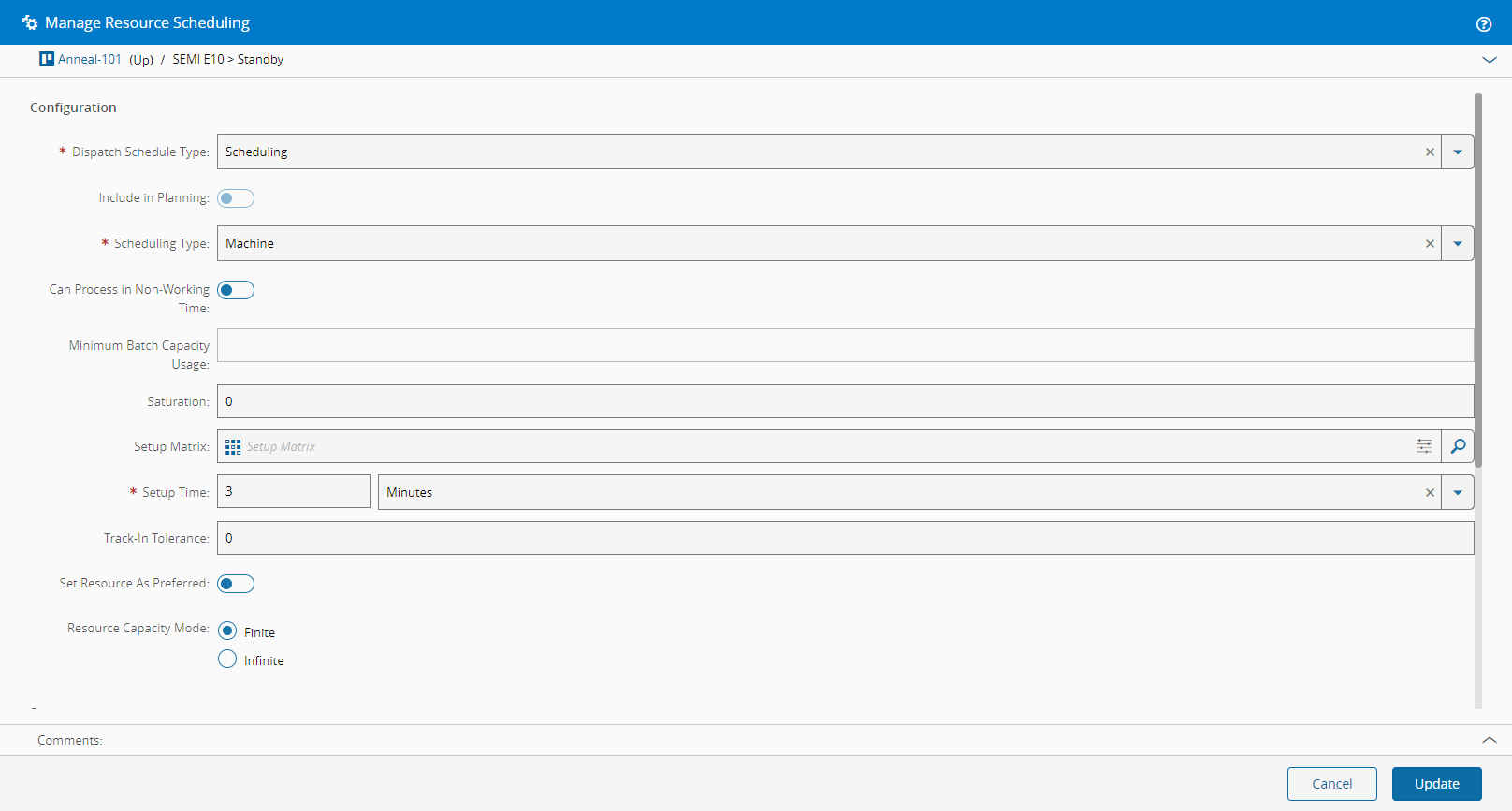 - Optionally, select a Setup Matrix to be used when scheduling the Resource.