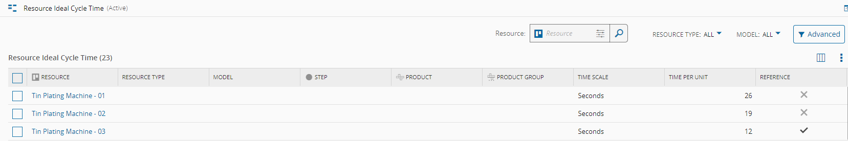 - The ResourceIdealCycleTime smart table must be filled in with the appropriate values for your production environment. For each combination of Product per either Resource, Resource Type or Resource Model, define: