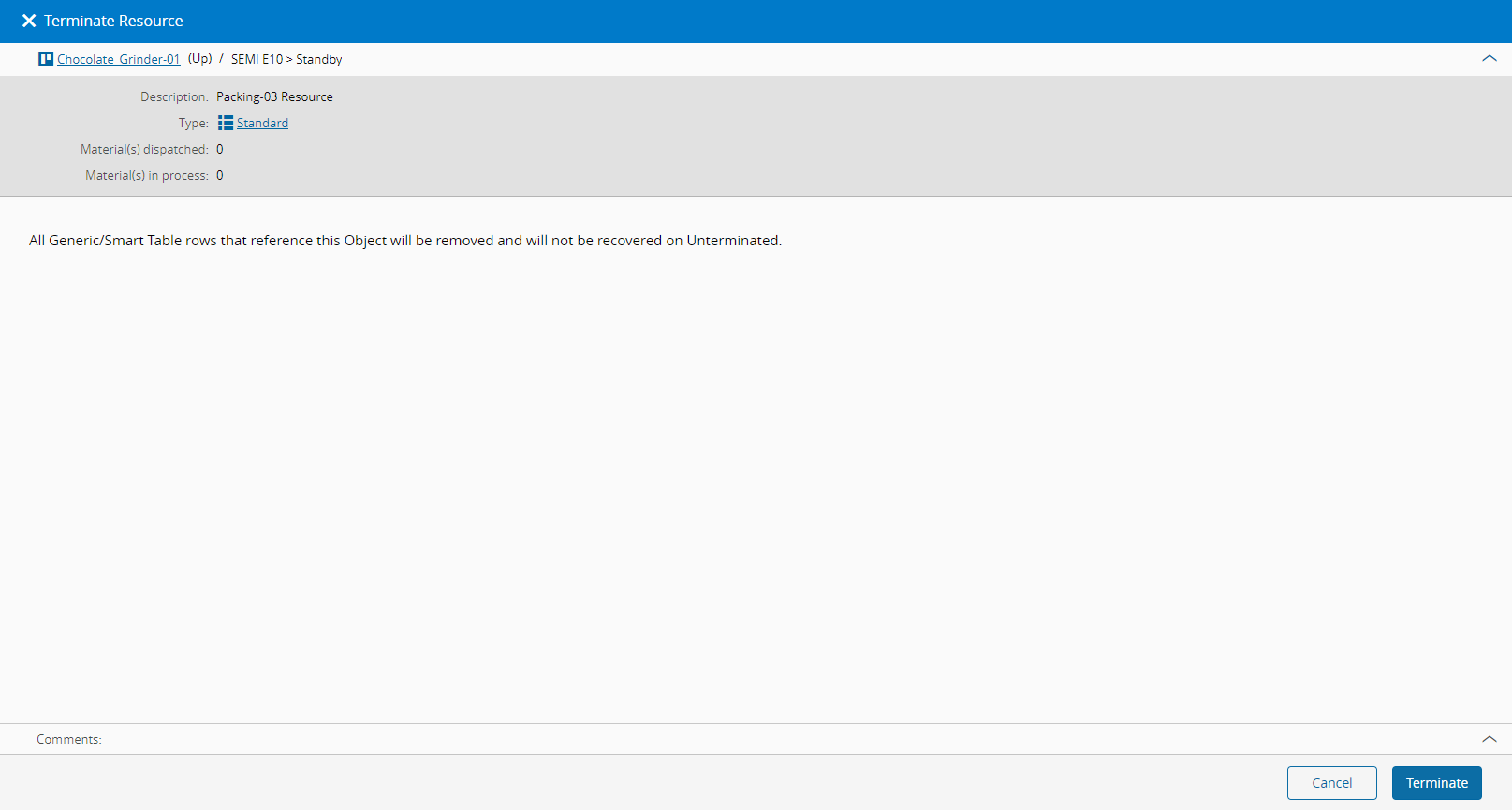 - Select Terminate to perform the operation. All generic/smart table rows that reference the current object will be removed and will not be recovered if the object is unterminated at a later point.
