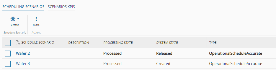 This operation allows a Schedule Scenario to become the released scenario for the Schedule, setting the order of manufacturing execution (Track-In, Track-Out, Move-Next) for a given production schedule. After the release of a Schedule Scenario, it is no longer possible to synchronize the jobs, only adjusting is permitted.