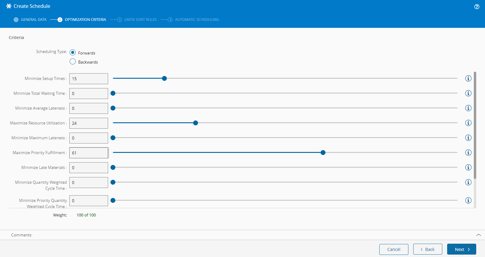 In the same tab you must choose the Optimization Criteria to be used for the Scheduling process. It is possible to combine different scenarios, either by adjusting the sliders or by inputting a weight in the text number next to each Criteria. All the weights used must add up to 100. The available criteria are: