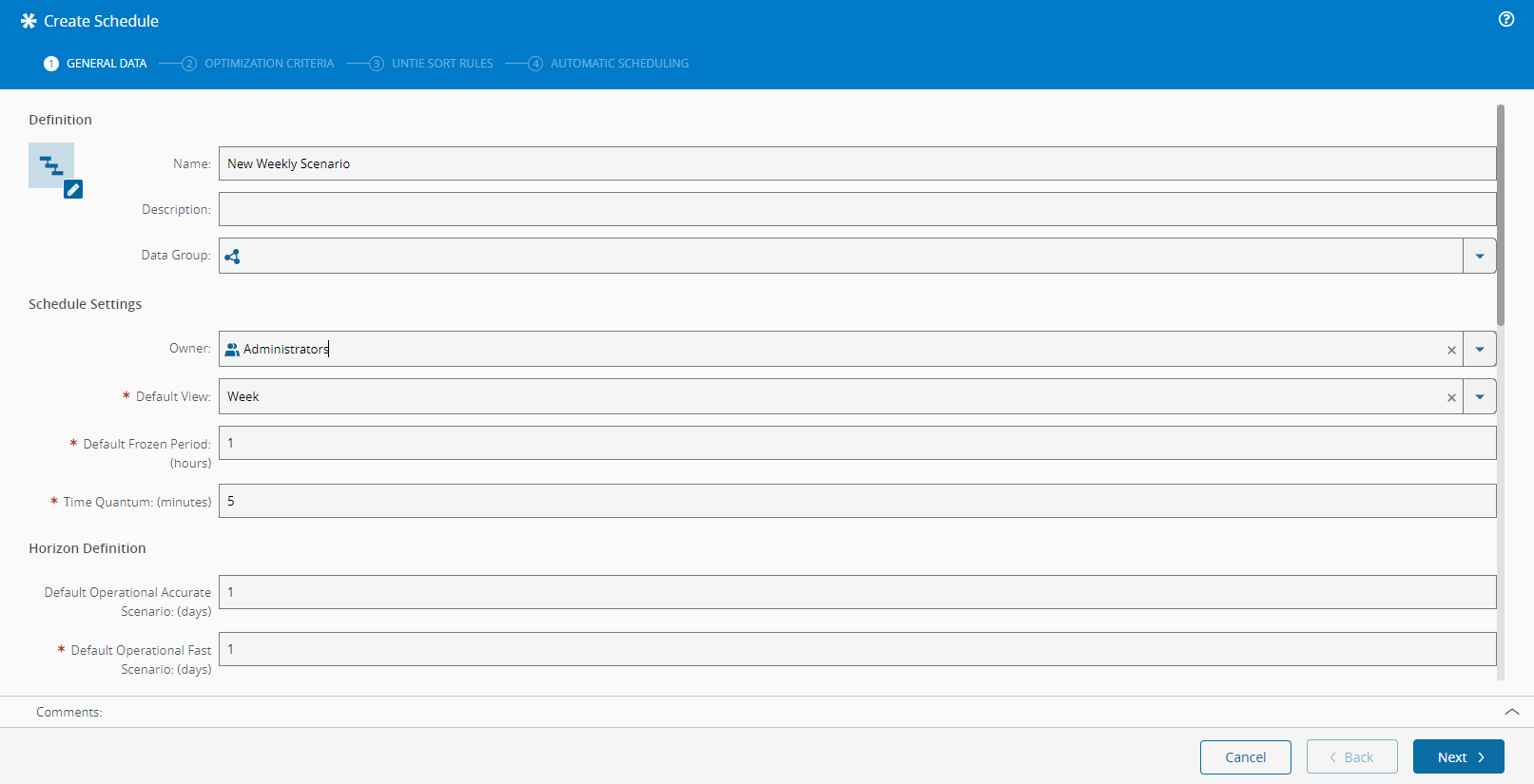 - In the Default Operational Accurate Scenario, define the default length, in days, of the planning horizon to be considered for Operational Accurate Scenarios.