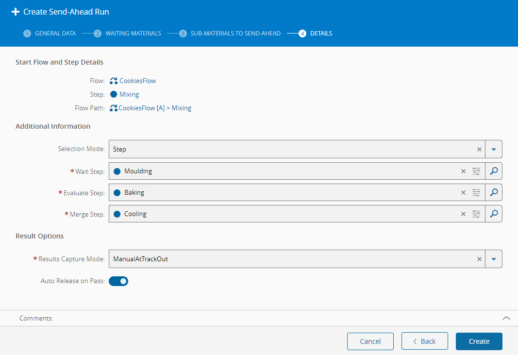General data will be displayed on the Flow and Step of the Materials for which the Send-Ahead Run will be created. You can also define some additional configurations: