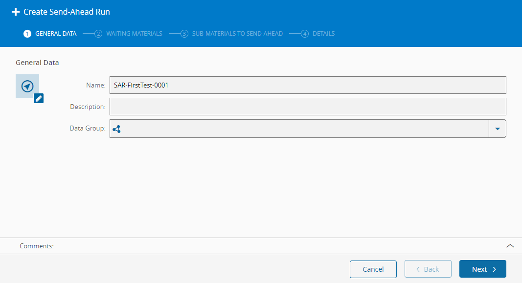 You can create a Send-Ahead Run from the Send-Ahead Run section in the Business Data menu by selecting the New button, from the Material details page or through any other location where Material details can be accessed. After starting the wizard, the system will allow you to configure the new entity through a number of steps.