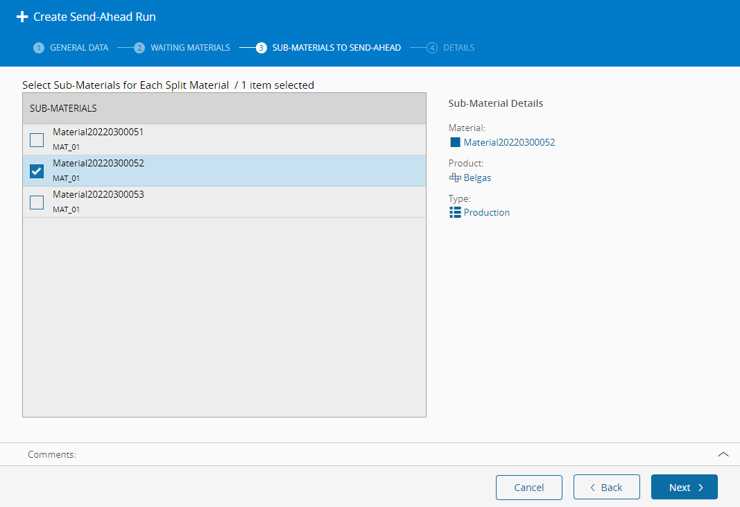 In this step select which of the Sub-Materials to be included in the Send-Ahead Run. At least one Sub-Material must be selected.