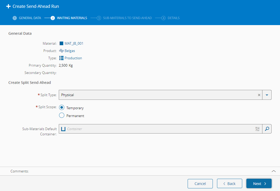 General data will be displayed on the Material for which the Send-Ahead Run will be created. You can also define some additional configurations for each Material: