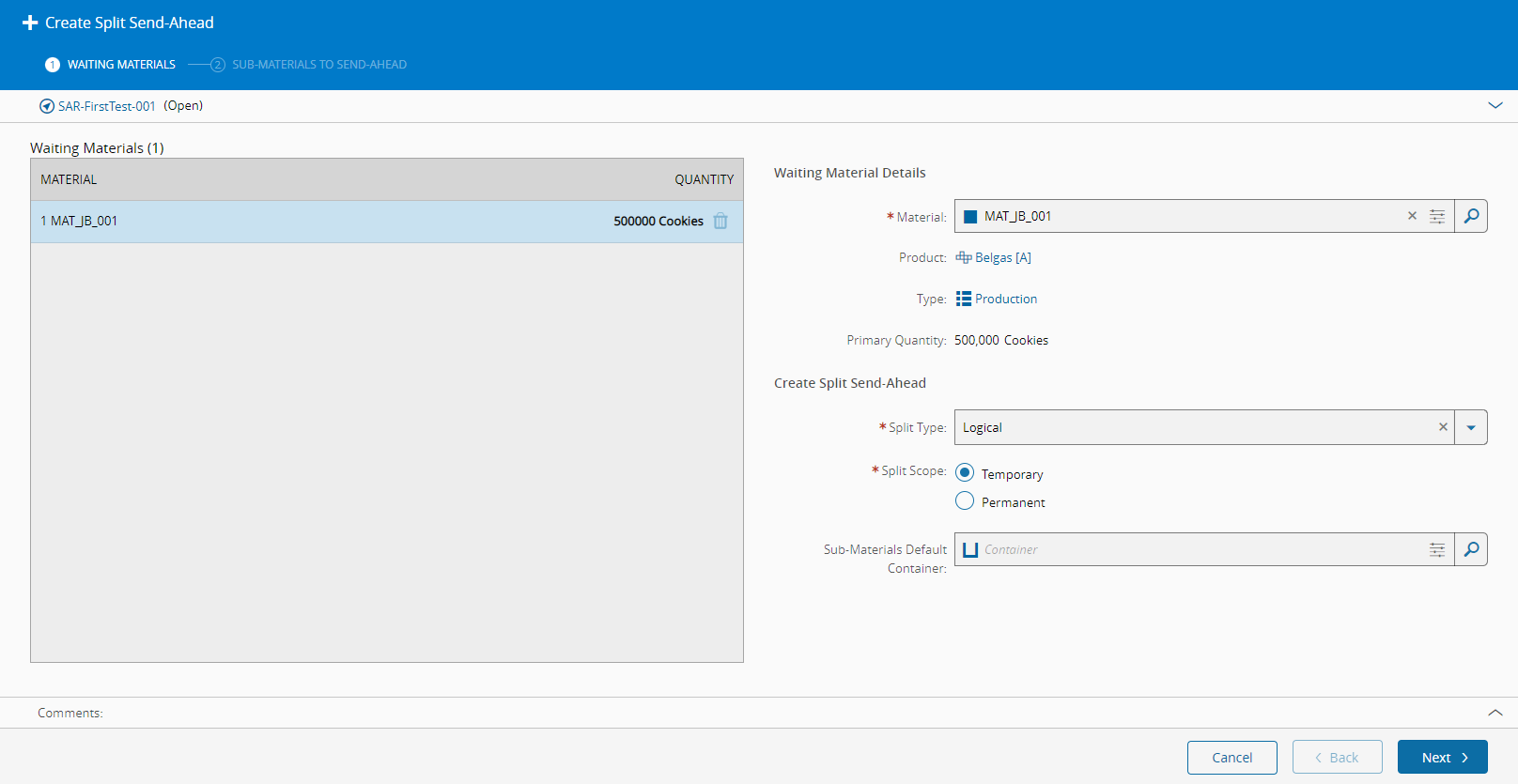 This operation is used to split any Waiting Materials associated to a Send-Ahead Run and add the Sub-Materials as send-ahead Materials.