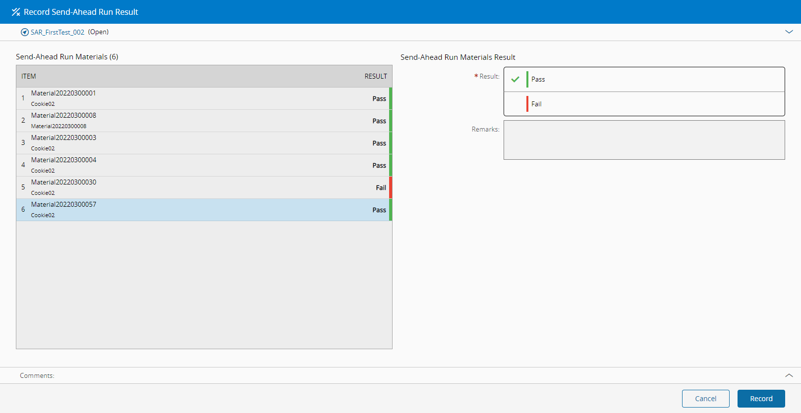 PassorFail. You can optionally add remarks to the record. - Select Record to complete the operation.
