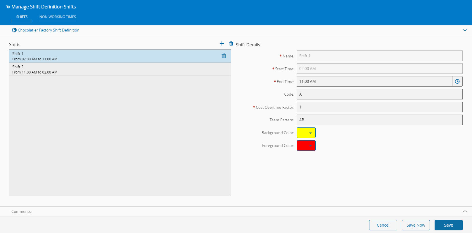- Shifts - displays and manages information on the shifts that compose the Shift Definition.