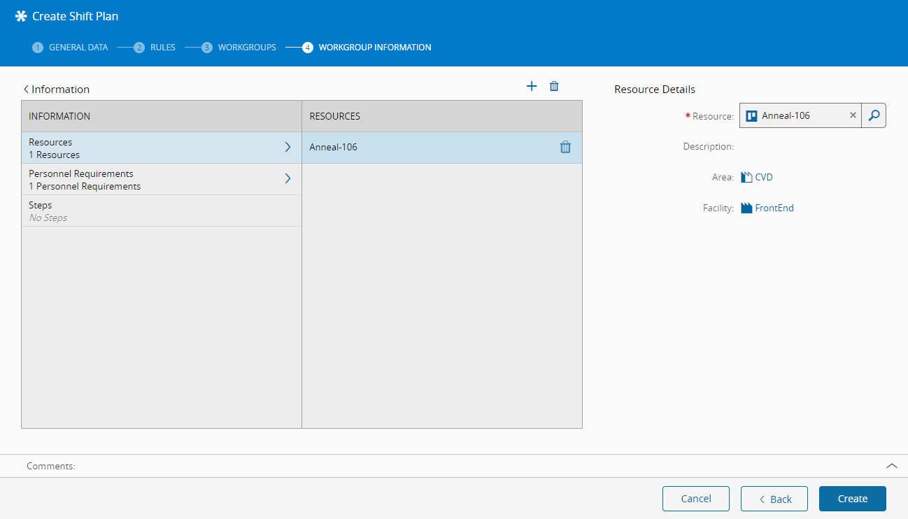 - The Resources that belong to that Workgroup. A Resource can only be added one time to a Shift Plan and the Area Calendar of the Resource does not have to match the Calendar of the Shift Plan.