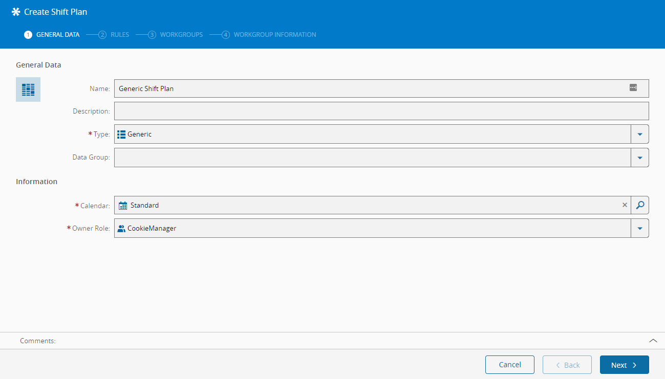 - Select the Shift Plan type. The list of possible values is taken from the lookup table ShiftPlanType.