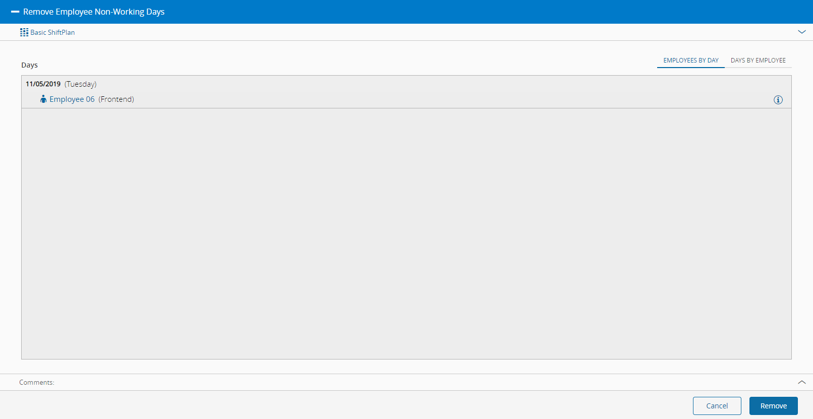 Select the desired Employee Calendar Days in the Shift Plan, then select Remove Non-Working Days from the Remove dropdown button and follow the steps below: