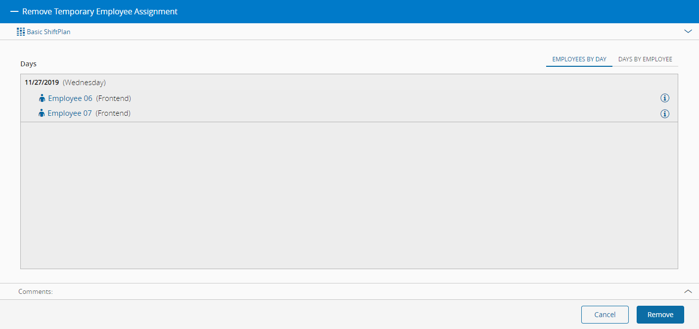 Select the desired Employee Calendar Days in the Shift Plan, then select Remove Temporary Assignment from the Remove dropdown button and follow the steps below: