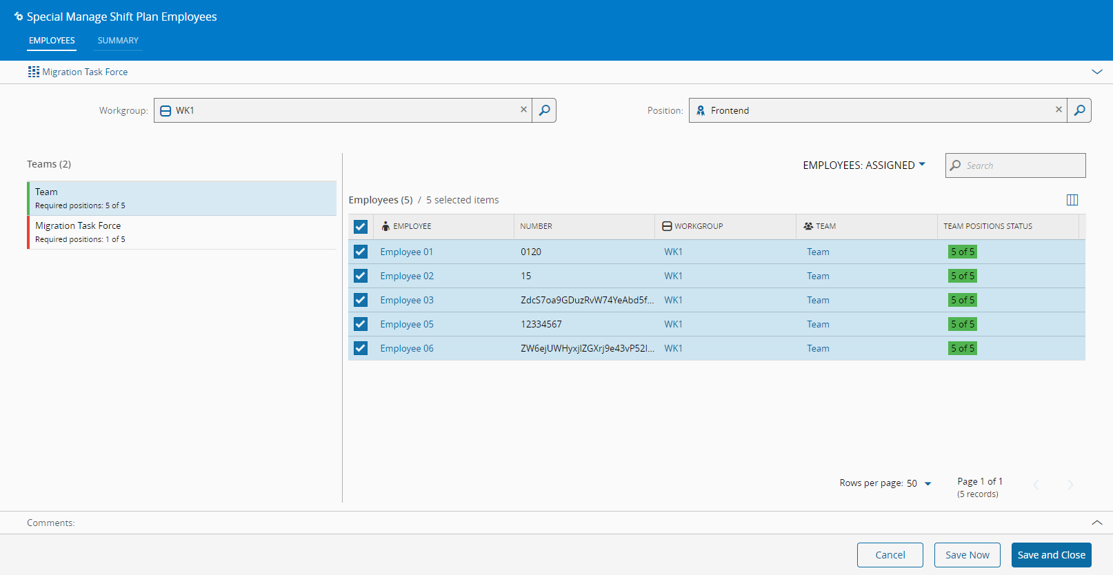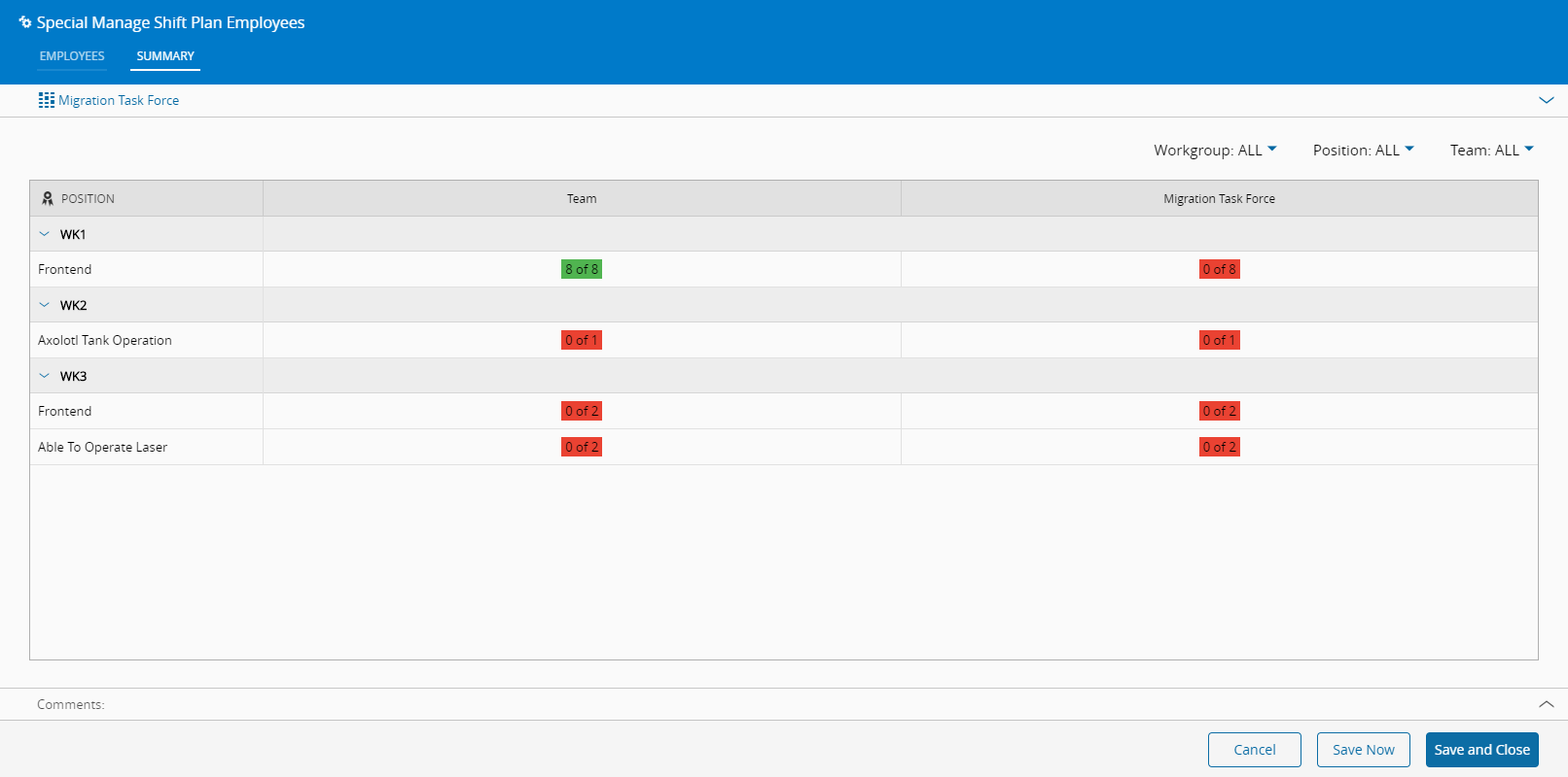 The dialog will display information on the different configurations needed for the Shift Plan. On the top of the dialog, you can filter the entries by the Workgroup and the Position that is required of the Employees for that particular operation. Looking at the left side, the Teams that have to be filled are listed, along with the number of positions that require filling. Finally, on the right-side, you can see the Employees available for assignment, with active filters to allow easy selection. The Employees can be filtered by: