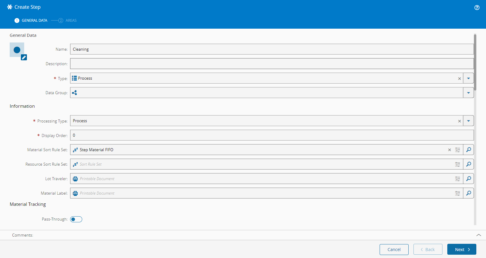 Specify whether the Step is Pass-Through. A Material in a Pass-Through Step can only be moved next, it cannot be dispatched or tracked in.
