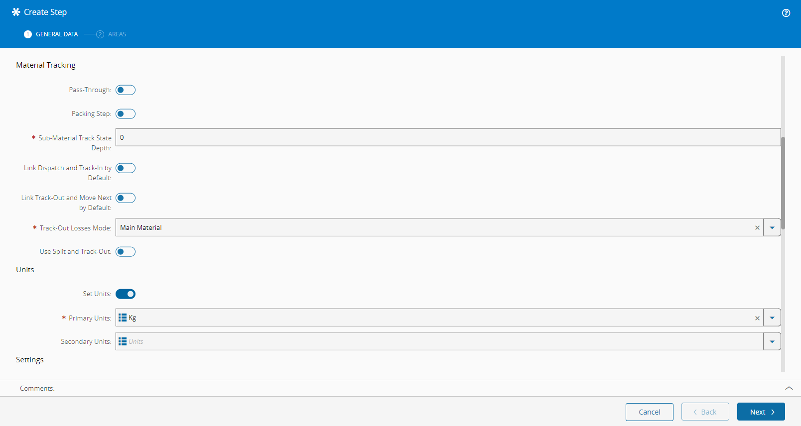 true, it is necessary to specify the primary units and optionally, the secondary units of the Step. - Select whether Shipping is allowed for this Step.