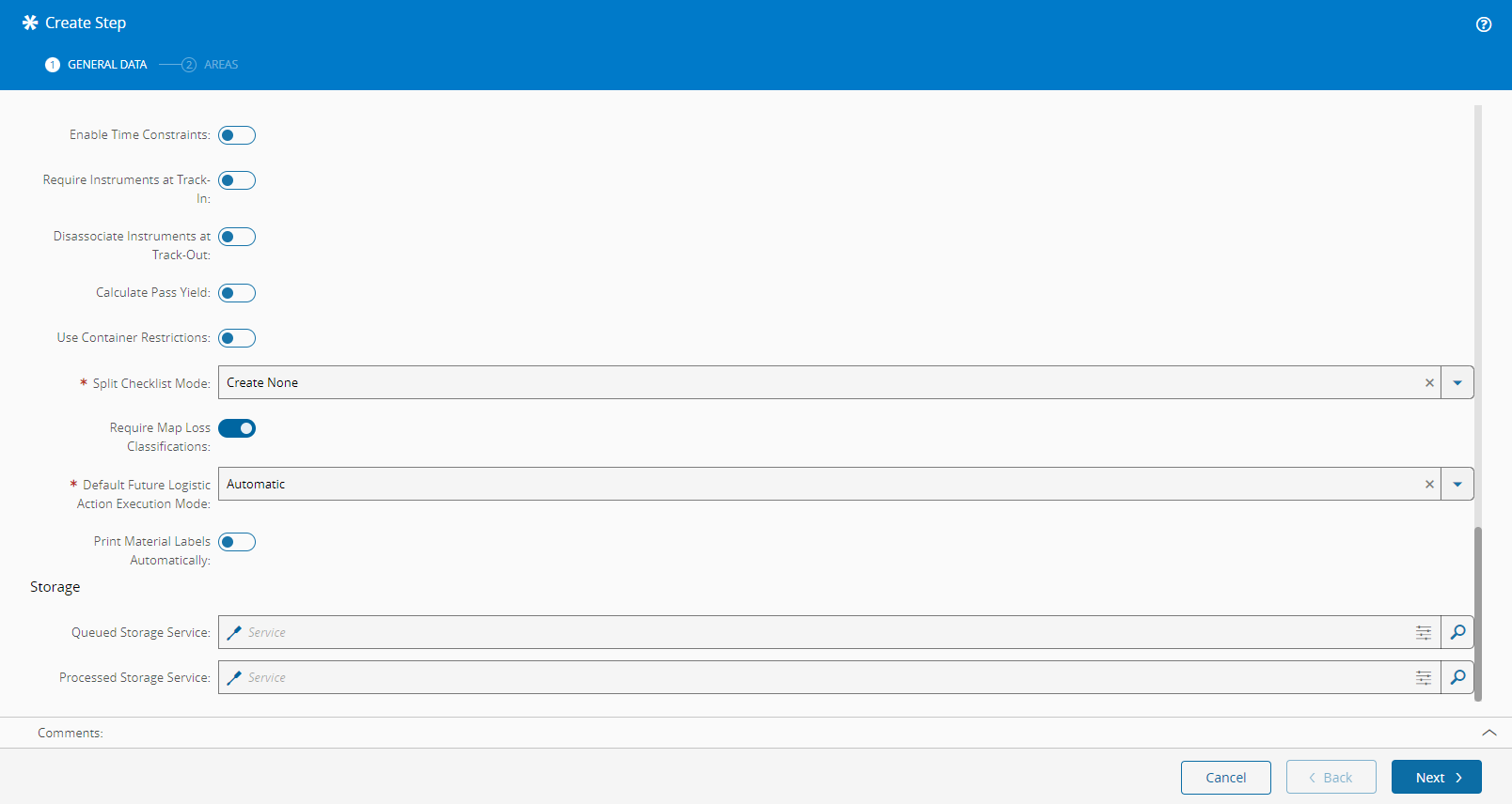 Optionally, select the Queued and Processed services used for Storage of Material at this Step - these services must be of type Storage and they will be used by the Store Material operation for queued and processed Material respectively.