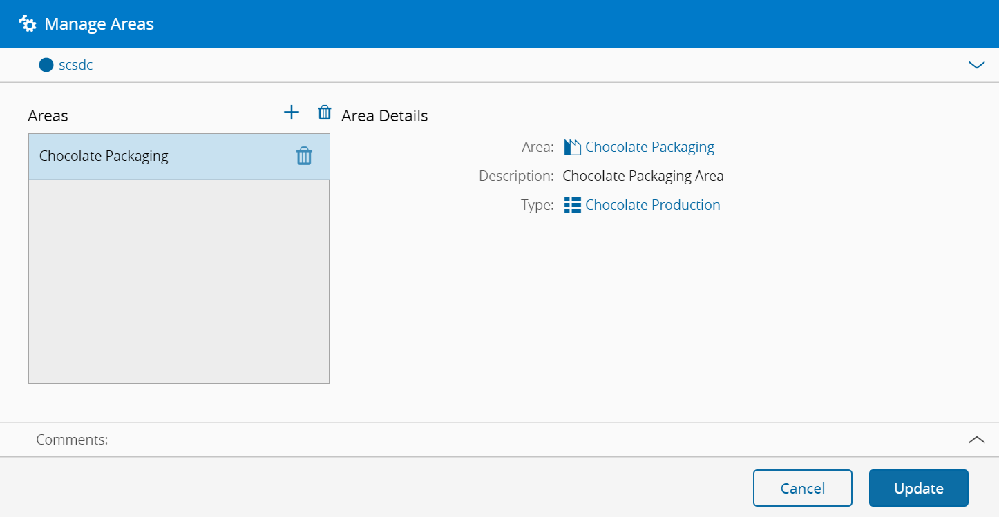 1. Add or remove Areas belonging to the Step, by using the and buttons in the grid's toolbar. A Step must belong to at least one Area and it can only belong to one Area per Facility.