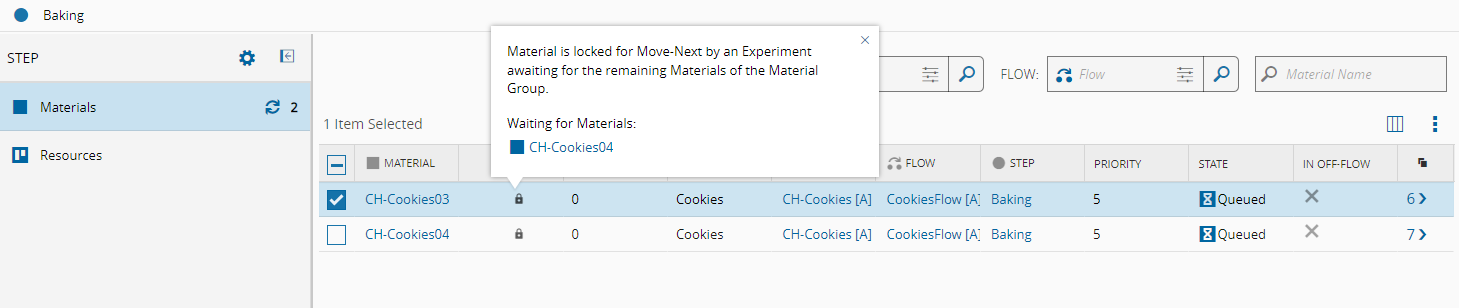 When the Materials are waiting for an Experiment in the Step, a lock badge will appear in the column next to Material. Clicking on it will display a pop-over message, as shown in the image below.