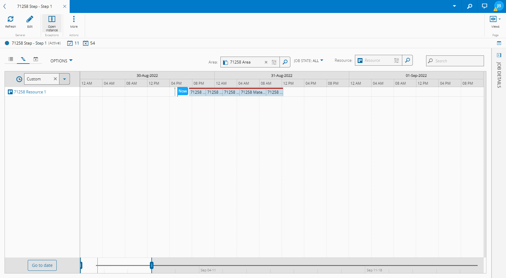 The Schedule View is available when the Include in Scheduling property is set to true. This view provides a timeline view of the Materials set to be processed at this Step. You can filter by Area, Resource or job state.