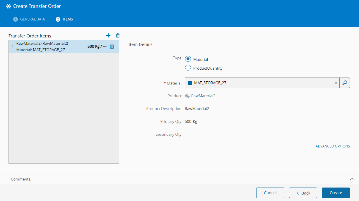Optionally, specify additional context data for the Transfer Order in the Advanced Options section by selecting:
