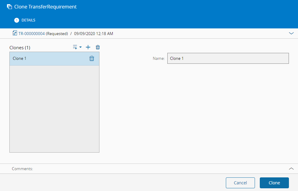 This operation is used to clone an existing Transfer Requirement into a new Transfer Requirement with a different name and identical characteristics.