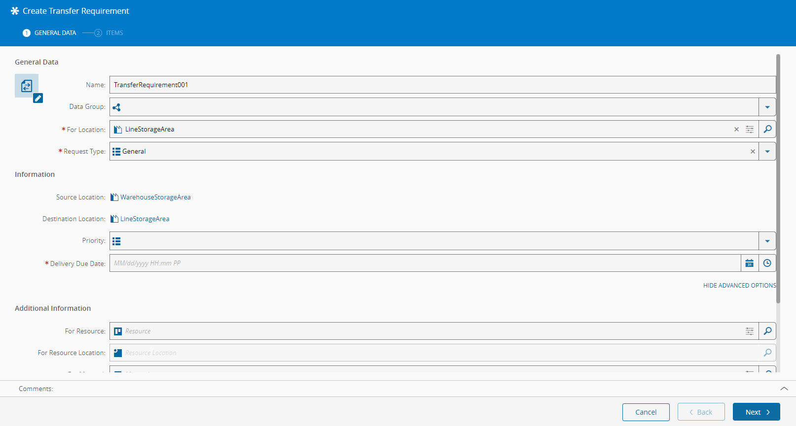 - Source Location will be set according to the Transfer Requirement Type of the For Location Area.