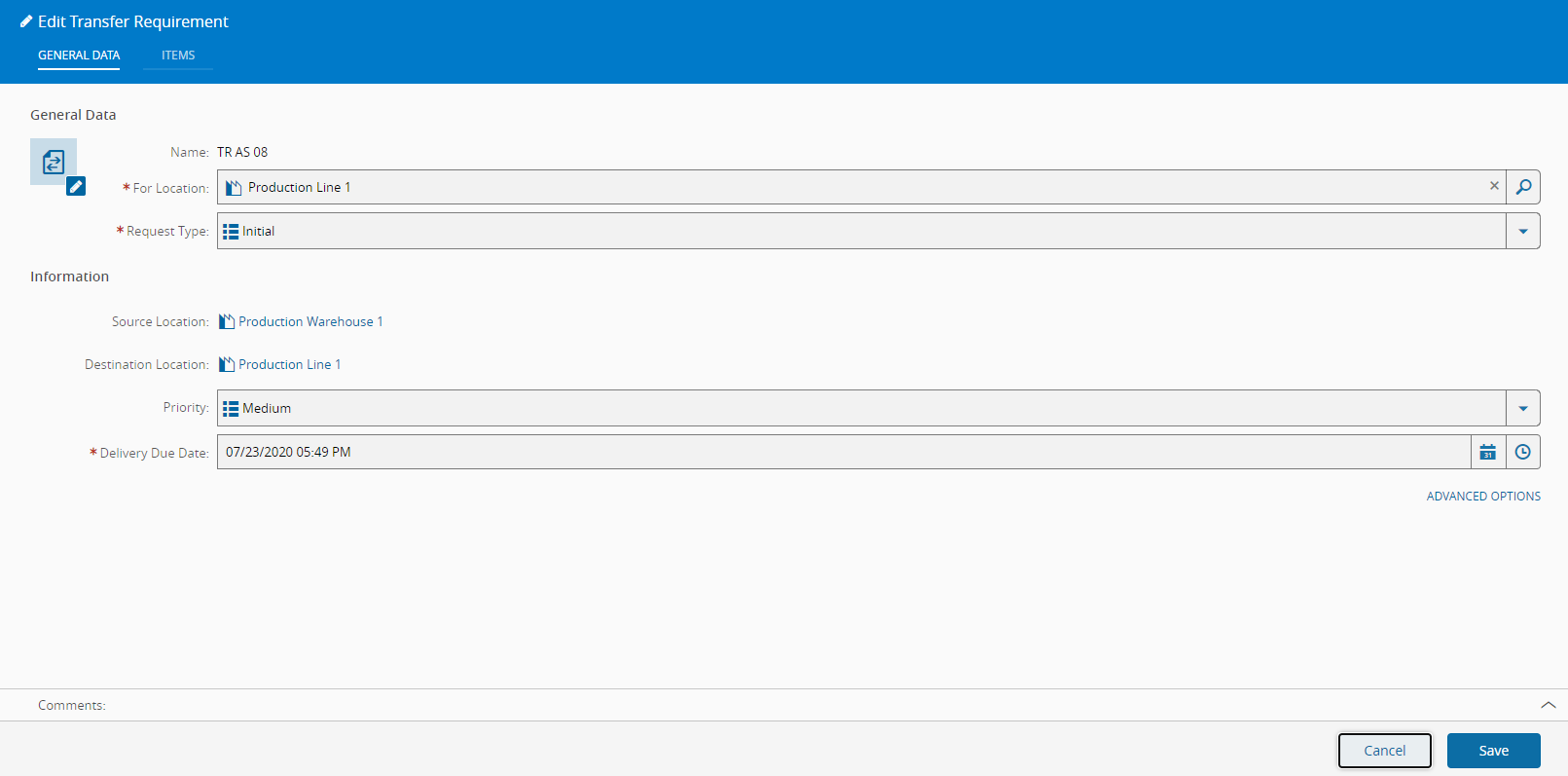 The Edit Transfer Requirement wizard can be called from the Transfer Requirement page within the Business Data Group.