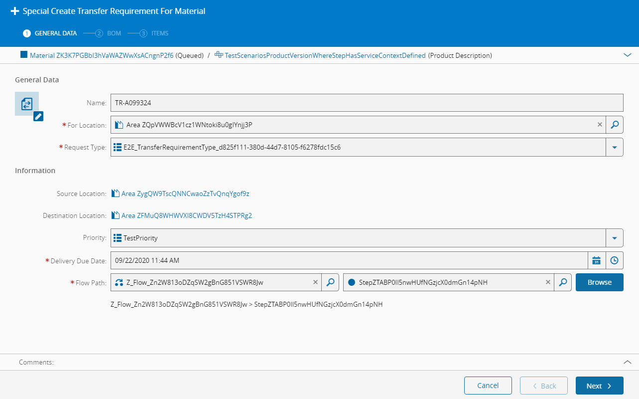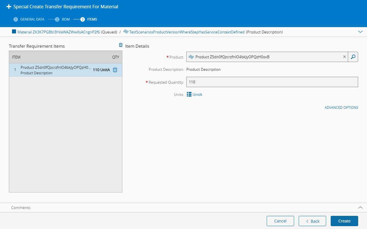 This operation is used to create a new Transfer Requirement for a specific Material using a selected BOM context.