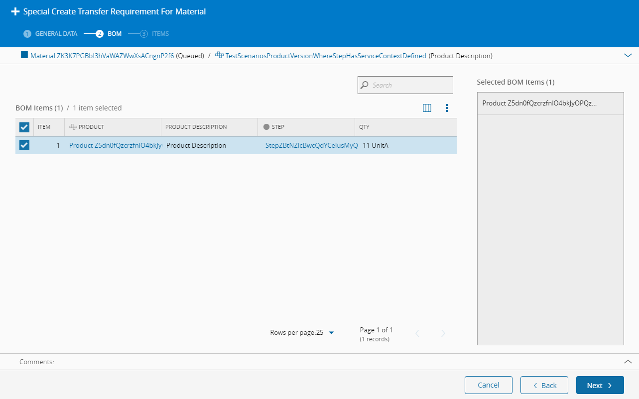 - On the left side panel, select the items from the Material BOM that will be included in the Transfer Requirement. Select Next to edit information for those items.