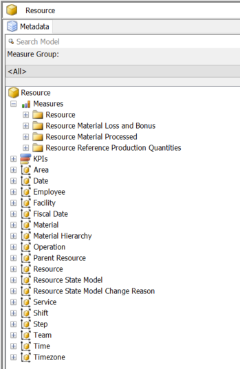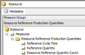 This section describes the Resource Reference Production Quantities Measure Group. These measures reflect the configuration set for the Resource Ideal Cycle time (is reference=true rows) at the time of data aggregation.