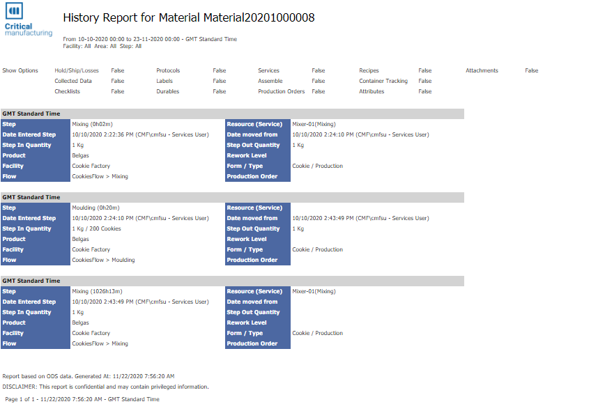 • Material - the name of the Material for which the history report is to be displayed