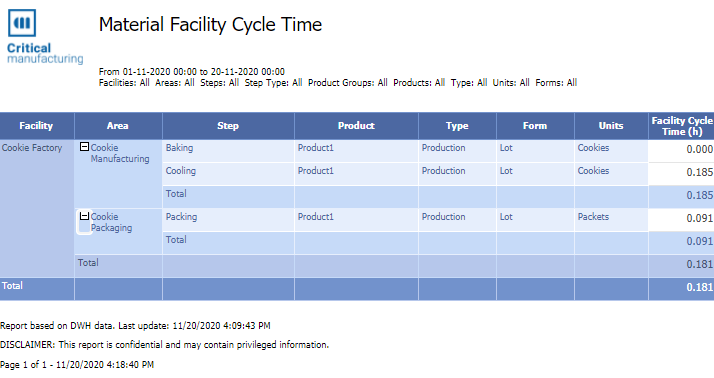 This report provides information related to Facility cycle time - how long does it take to process a Material at a Facility.