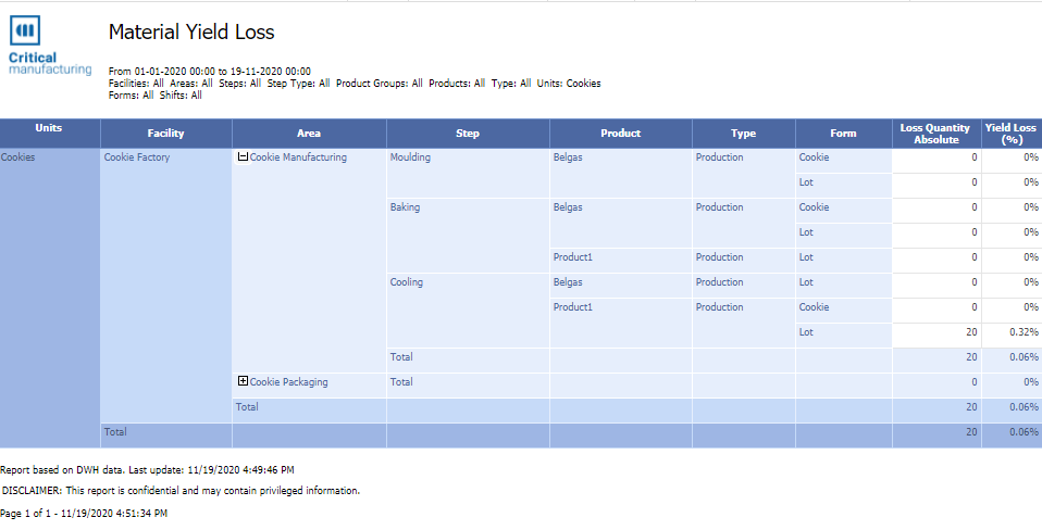 - Yield Loss (%) - can be calculated as the LossQuantityAbsolute divided by the QuantityProcessed over a period of time, that is, the (Material TrackInQuantity - Material Quantity)/(Material TrackInQuantity) at TrackOut. If Material TrackInQuantity is zero, the YieldLossPercentage is zero. The aggregation of YieldLossPercentage is equal to [SUM(Material TrackInQuantity) - SUM (Material Quantity)]/SUM(Material TrackInQuantity) at TrackOut. Again, if SUM(Material TrackInQuantity ) is zero, the Yield Loss Percentage is equal to zero.